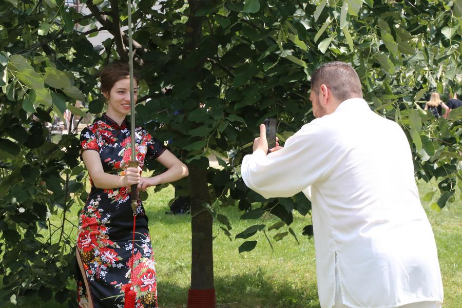 Mulher em trajes chineses segura espada chinesa ao posar para foto no Festival Asiático em Sófia, Bulgária, no dia 14 de junho de 2025. (Xinhua/Lin Hao)