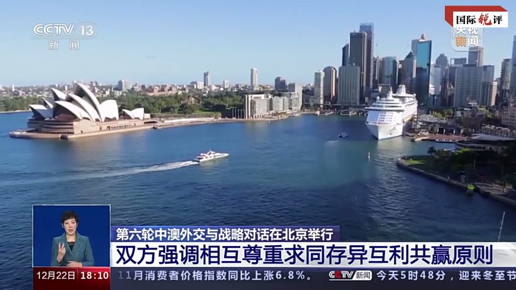 No mesmo dia, os ministros das Relações Exteriores da China e da Austrália realizaram a sexta rodada do Diálogo Diplomático e Estratégico em Beijing e chegaram a vários consensos sobre a melhoria das relações bilaterais. Os dois lados concordaram que as relações China-Austrália devem estar em conformidade com o posicionamento da parceria estratégica integral entre os dois países e embasadas no respeito mútuo, igualdade e benefícios recíprocos e gestão e controle das diferenças.