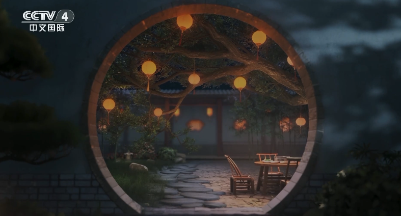 Na abertura da Gala do Festival do Meio Outono do Grupo de Mídia da China (CMG na sigla em inglês), uma lua cheia se ergue lentamente desde a beira do telhado, em forma de asa de uma torre, enquanto o eco de um sino antigo, o batimento potente do tambor e o canto melodioso ressoam em harmonia, dando início juntos a uma música de reunião familiar.