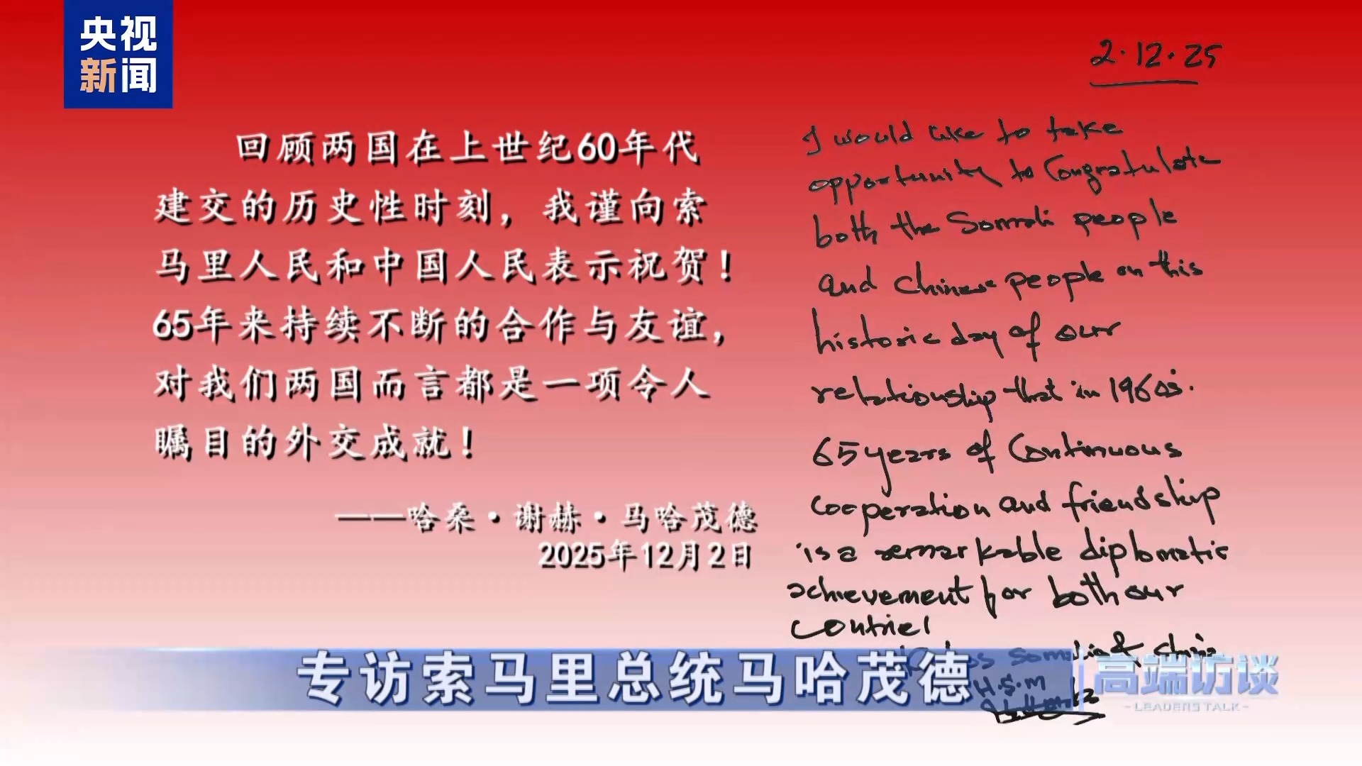 Presidente Mohamud: Primeiramente, agradeço muito a sua visita à Somália e ao meu gabinete, que me proporcionam a oportunidade de conversar com seus telespectadores. Como o senhor mencionou, a amizade entre a Somália e a China é profunda. Por décadas, nossos dois países mantiveram relações amistosas, uma amizade construída com base no respeito mútuo, sinceridade e confiança mútua. Desde a independência da Somália, a China tem consistentemente oferecido um firme apoio. Apesar dos mais de 30 anos de turbulência na Somália — guerra civil e destruição —, projetos-chave da cooperação Somália-China e o apoio fornecido pela China sobreviveram. Muitas dessas conquistas ainda servem à população hoje, como hospitais, estádios e rodovias. A relação entre a Somália e a China tem uma base histórica e pode-se dizer que atingiu um estágio de maturidade. Estamos trabalhando juntos para consolidar e expandir ainda mais a cooperação entre nossos dois países.