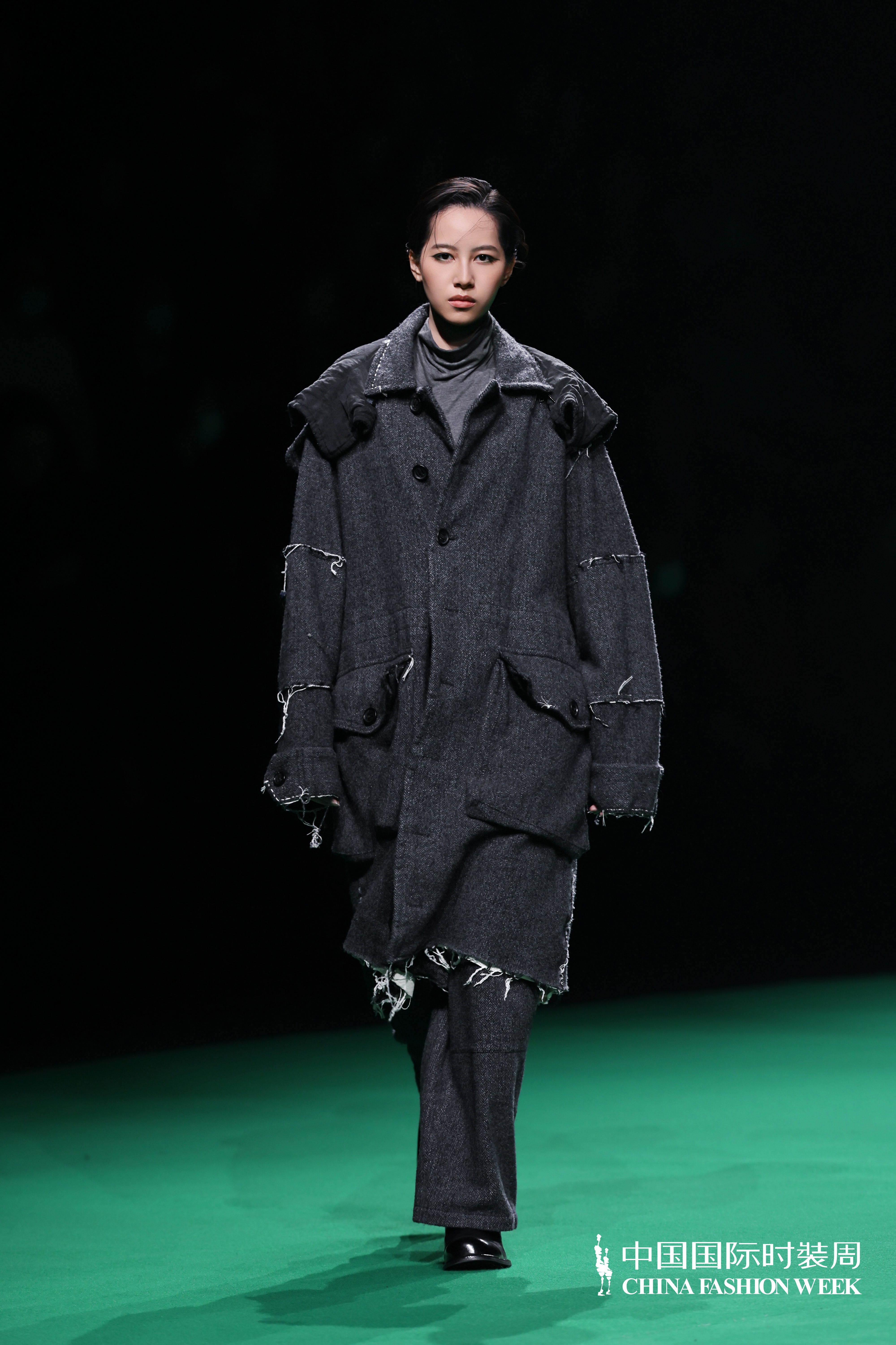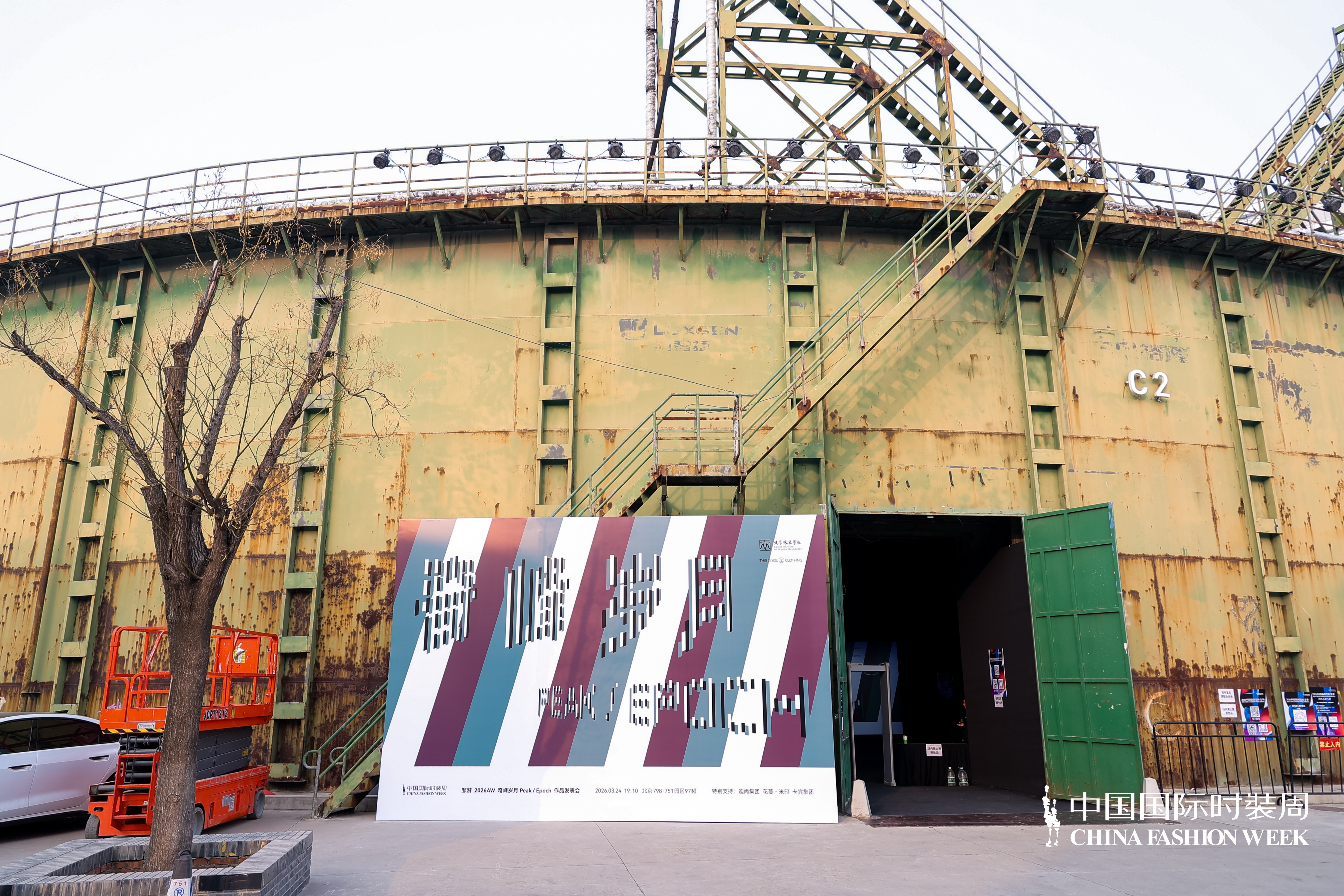 O desfile ocorreu no 97罐, antigo gasômetro do parque 798·751, uma arena circular de escala monumental. Ali, a moda dialogava com a memória industrial do espaço. Entre luz, movimento e performance, a roupa deixou de ser apenas imagem e passou a atuar como presença — atravessando corpo, espaço e história.