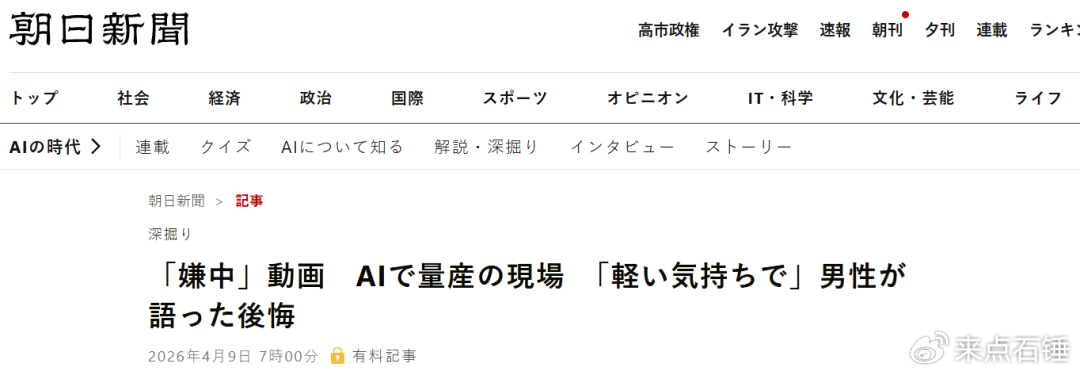 O jornal japonês Asahi Shimbun publicou no dia 9 deste mês uma importante matéria investigativa, apontando que a Inteligência Artificial (IA) está se tornando uma ferramenta para a produção em massa de vídeos falsos contra a China. Da geração de roteiros e síntese de imagens até a divisão de lucros com publicidade, leva-se apenas alguns minutos para produzir um conteúdo difamatório altamente incitador.