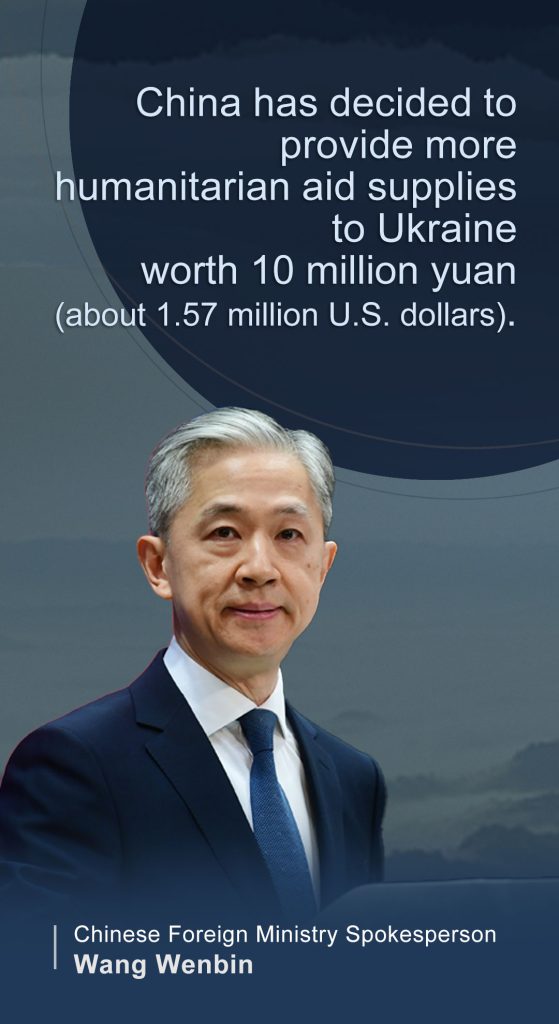 Wang Wenbin revelou em uma coletiva de imprensa diária que esta oferta adicional foi baseada no desenvolvimento da situação e nas necessidades reais da Ucrânia. A Cruz Vermelha da China já havia fornecido 5 milhões de yuans em suprimentos de ajuda humanitária ao país.