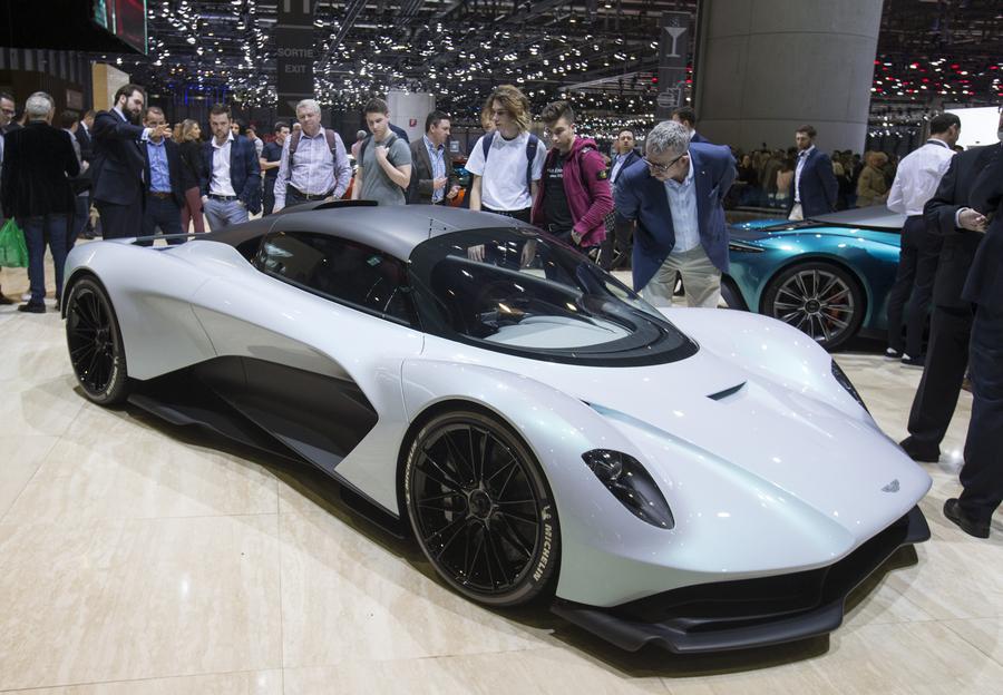 Pessoas olham hipercarro Aston Martin AM-RB 003 na 89ª edição do Salão Internacional do Automóvel de Genebra, em Genebra, Suíça, no dia 7 de março de 2019. (Xinhua/Xu Jinquan)
