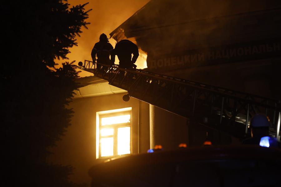 Bombeiros tentam apagar o fogo em um prédio em Donetsk, em 5 de agosto de 2023. (Foto por Victor/Xinhua)