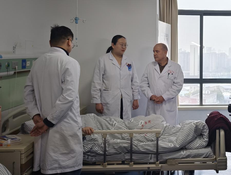 Pedro Castro (d) e Zhang Huiwen (c) realizam rondas na enfermaria do Segundo Hospital Popular Provincial de Anhui em Hefei, Província de Anhui, no leste da China, em 26 de fevereiro de 2025. (Xinhua/Guo Chen)