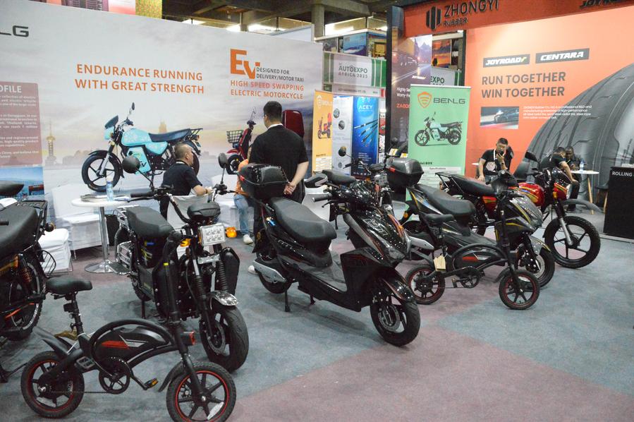 Expositores exibem bicicletas elétricas na Feira Internacional de Comércio da Exposição Automotiva, em Nairóbi, capital do Quênia, no dia 28 de maio de 2025. (Foto por Charles Onyango/Xinhua)