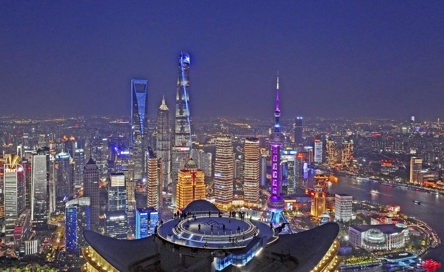 Foto aérea de drone mostra visitantes apreciando paisagem urbana no The Stage, um novo mirante no topo da White Magnolia Plaza em Shanghai, leste da China, no dia 14 de abril de 2025. (Xinhua/Liu Ying)