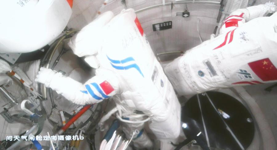 Esta imagem de tela capturada no Centro de Controle Aeroespacial de Beijing em 15 de agosto de 2025 mostra os taikonautas Chen Dong (à esquerda) e Wang Jie, da Shenzhou-20, preparando-se para deixar a estação espacial orbital chinesa para atividades extraveiculares. (Xinhua/Li Yanchen)