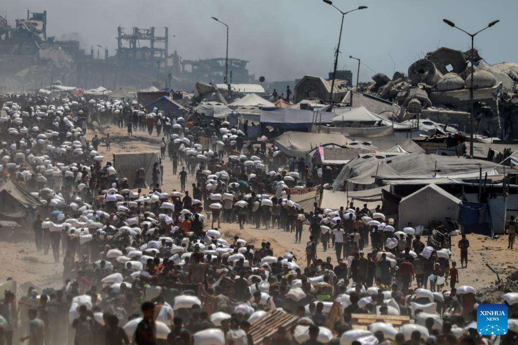 Palestinos buscam ajuda humanitária que entrou em Gaza por uma passagem de fronteira, em Beit Lahia, norte da Faixa de Gaza, em 27 de julho de 2025. Enquanto o Dia Mundial Humanitário é comemorado em vários países na terça-feira, o Oriente Médio e o Norte da África continuam atolados em algumas das crises mais graves do mundo, especialmente as humanitárias. Em Gaza, no Sudão, na Síria, no Líbano e no Iêmen, o conflito armado continua em meio à fome, doenças e sistemas de abastecimento de água em colapso. As lutas diárias pela sobrevivência, para conseguir comida, obter remédios ou buscar água, agora trazem consigo o risco de morte. O padrão é consistente: onde a guerra persiste, a fome e as doenças acompanham. O fornecimento de ajuda humanitária pode diminuir o ritmo, mas sem a vontade política para encerrar os combates, essa ajuda essencial é drasticamente insuficiente. (Foto por Rizek Abdeljawad/Xinhua)