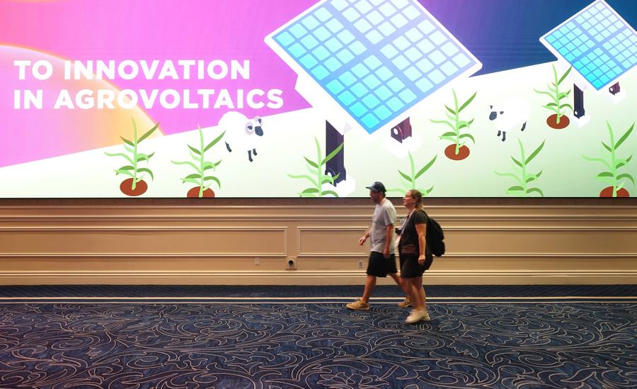 Visitantes passam por tela eletrônica na feira RE+ em Las Vegas, Estados Unidos, em 8 de setembro de 2025. (Foto por Zeng Hui/Xinhua)