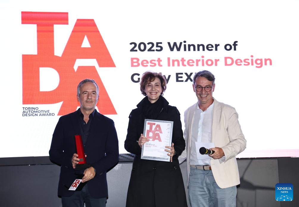 Representantes do Geely EX5 recebem prêmio de Melhor Design de Interiores do Prêmio de Design Automotivo de Turim (TADA, na sigla em inglês) no Salão do Automóvel de Turim 2025, em Turim, Itália, em 26 de setembro de 2025. O Salão do Automóvel de Turim 2025 foi inaugurado na sexta-feira na cidade de Turim, no norte da Itália. Como um dos salões de automóveis mais antigos do mundo, o evento de Turim estreou o Prêmio de Design Automotivo de Turim (TADA, na sigla em inglês), um dos destaques da exposição deste ano. Lançado pelos organizadores do evento, o TADA é o primeiro prêmio profissional de design automotivo na Europa a apoiar oficialmente a cooperação entre as indústrias automobilísticas chinesa e europeia. Com o tema “Piemonte encontra a China“, o prêmio inaugural reconhece as conquistas inovadoras de modelos chineses ativos no mercado europeu. As seleções finais foram feitas por um júri internacional composto por nove importantes instituições italianas de design automotivo. (Xinhua/Li Jing)