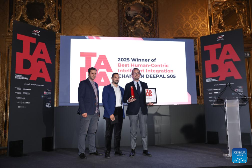 Representantes do Changan Deepal S05 recebem prêmio de Melhor Integração Inteligente Centrada no Ser Humano do Prêmio de Design Automotivo de Turim (TADA, na sigla em inglês) no Salão do Automóvel de Turim 2025, em Turim, Itália, em 26 de setembro de 2025. O Salão do Automóvel de Turim 2025 foi inaugurado na sexta-feira na cidade de Turim, no norte da Itália. Como um dos salões de automóveis mais antigos do mundo, o evento de Turim estreou o Prêmio de Design Automotivo de Turim (TADA, na sigla em inglês), um dos destaques da exposição deste ano. Lançado pelos organizadores do evento, o TADA é o primeiro prêmio profissional de design automotivo na Europa a apoiar oficialmente a cooperação entre as indústrias automobilísticas chinesa e europeia. Com o tema “Piemonte encontra a China“, o prêmio inaugural reconhece as conquistas inovadoras de modelos chineses ativos no mercado europeu. As seleções finais foram feitas por um júri internacional composto por nove importantes instituições italianas de design automotivo. (Xinhua/Li Jing)