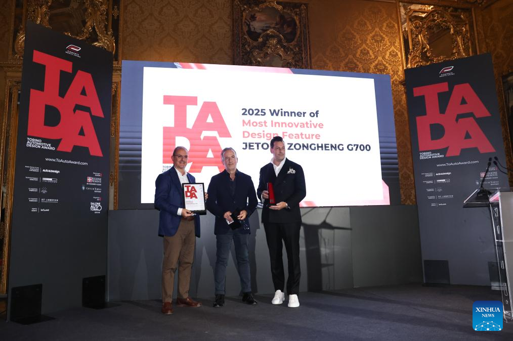 Representantes do Jetour Zongheng G700 recebem prêmio de Design Mais Inovador do Prêmio de Design Automotivo de Turim (TADA, na sigla em inglês) no Salão do Automóvel de Turim 2025, em Turim, Itália, em 26 de setembro de 2025. O Salão do Automóvel de Turim 2025 foi inaugurado na sexta-feira na cidade de Turim, no norte da Itália. Como um dos salões de automóveis mais antigos do mundo, o evento de Turim estreou o Prêmio de Design Automotivo de Turim (TADA, na sigla em inglês), um dos destaques da exposição deste ano. Lançado pelos organizadores do evento, o TADA é o primeiro prêmio profissional de design automotivo na Europa a apoiar oficialmente a cooperação entre as indústrias automobilísticas chinesa e europeia. Com o tema “Piemonte encontra a China“, o prêmio inaugural reconhece as conquistas inovadoras de modelos chineses ativos no mercado europeu. As seleções finais foram feitas por um júri internacional composto por nove importantes instituições italianas de design automotivo. (Xinhua/Li Jing)
