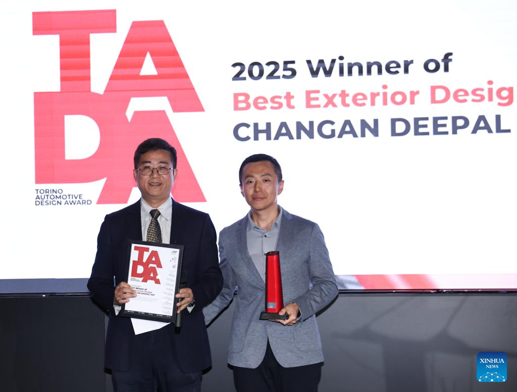 Representantes do Changan Deepal S07 recebem prêmio de Melhor Design Exterior do Prêmio de Design Automotivo de Turim (TADA, na sigla em inglês) no Salão do Automóvel de Turim 2025, em Turim, Itália, em 26 de setembro de 2025. O Salão do Automóvel de Turim 2025 foi inaugurado na sexta-feira na cidade de Turim, no norte da Itália. Como um dos salões de automóveis mais antigos do mundo, o evento de Turim estreou o Prêmio de Design Automotivo de Turim (TADA, na sigla em inglês), um dos destaques da exposição deste ano. Lançado pelos organizadores do evento, o TADA é o primeiro prêmio profissional de design automotivo na Europa a apoiar oficialmente a cooperação entre as indústrias automobilísticas chinesa e europeia. Com o tema “Piemonte encontra a China“, o prêmio inaugural reconhece as conquistas inovadoras de modelos chineses ativos no mercado europeu. As seleções finais foram feitas por um júri internacional composto por nove importantes instituições italianas de design automotivo. (Xinhua/Li Jing)
