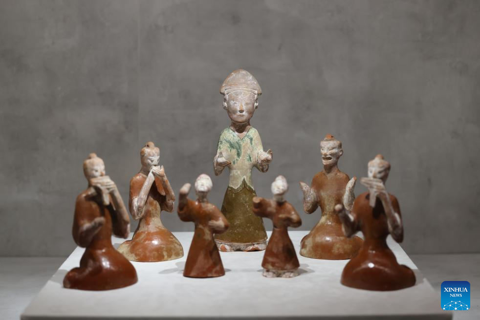 Foto tirada em 28 de setembro de 2025 mostra estátuas de músicos na exposição de instrumentos musicais chineses intitulada “O Som da Harmonia: Instrumentos Musicais na China Antiga”, em Riad, Arábia Saudita. O evento foi inaugurado na noite de domingo no Museu Nacional Saudita. A exposição apresenta mais de 100 peças e conjuntos de instrumentos musicais do Museu Nacional da China, incluindo flautas de ossos, conjuntos de sinos de bronze (Bianzhong), cítaras Guqin e flautas que traçam a evolução da música e da estética chinesas ao longo de milênios. (Xinhua/Wang Haizhou)