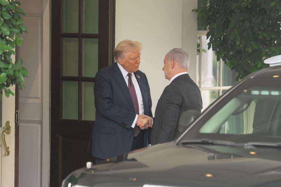O presidente dos EUA, Donald Trump (esquerda), cumprimenta o primeiro-ministro israelense, Benjamin Netanyahu, na Casa Branca em Washington, D.C., Estados Unidos, em 29 de setembro de 2025. (Xinhua/Hu Yousong)
