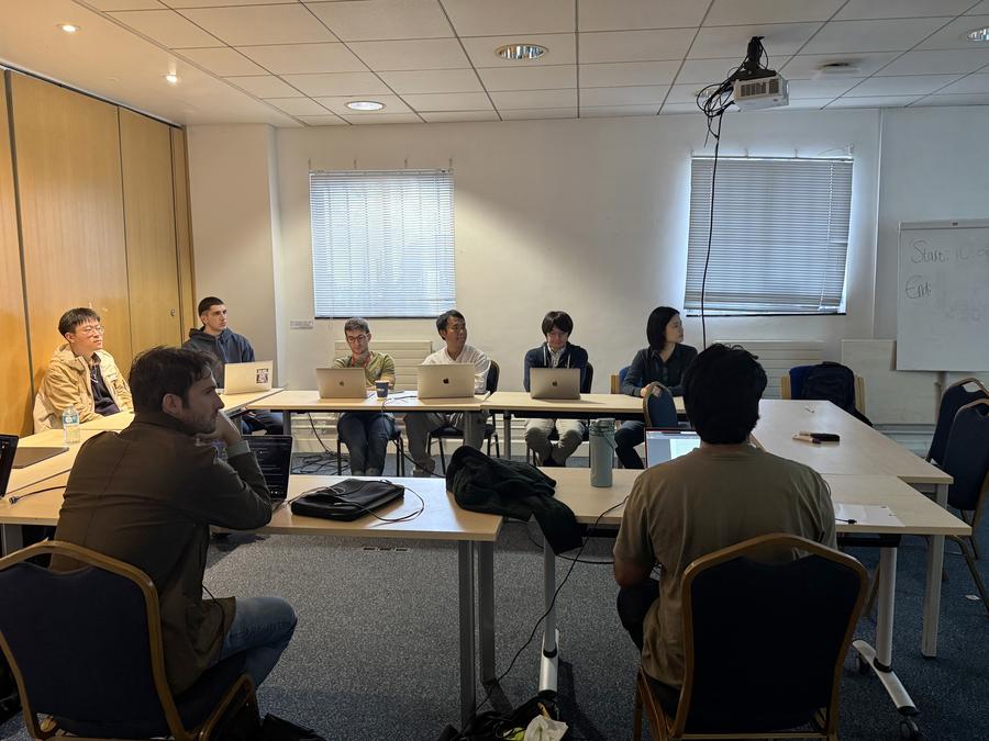 Li Yingzhen (1ª à direita, fundo) lidera sua reunião semanal de pesquisa com estudantes de doutorado em Londres, Reino Unido, em 7 de outubro de 2025. (Xinhua/Gao Wencheng)