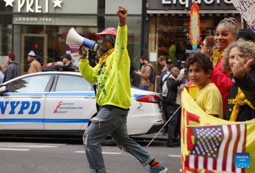 Pessoas participam do protesto “No Kings” (“Sem Reis”, em tradução livre) em Manhattan, Nova York, Estados Unidos, em 18 de outubro de 2025. Milhares de pessoas foram às ruas em 2.700 cidades e vilas americanas no sábado para a segunda rodada dos protestos nacionais “No Kings”, a maior manifestação em um único dia na história americana. Após o primeiro protesto nacional “No Kings” em 14 de junho, esta rodada de manifestações, abrangendo todos os 50 estados, ocorreu quando a paralisação do governo federal entrou em seu 18º dia sem resoluções à vista. (Xinhua/Zhang Fengguo)
