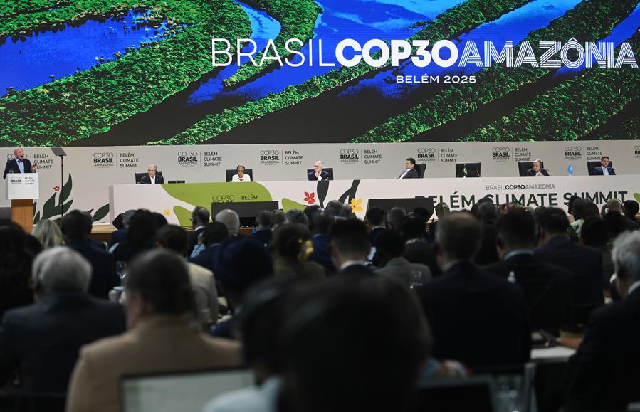 Participantes comparecem à Cúpula do Clima de Belém, antes da 30ª edição da Conferência das Partes (COP30) da Convenção-Quadro das Nações Unidas sobre Mudanças Climáticas, em Belém, Brasil, em 6 de novembro de 2025. (Foto por Lucio Tavora/Xinhua)